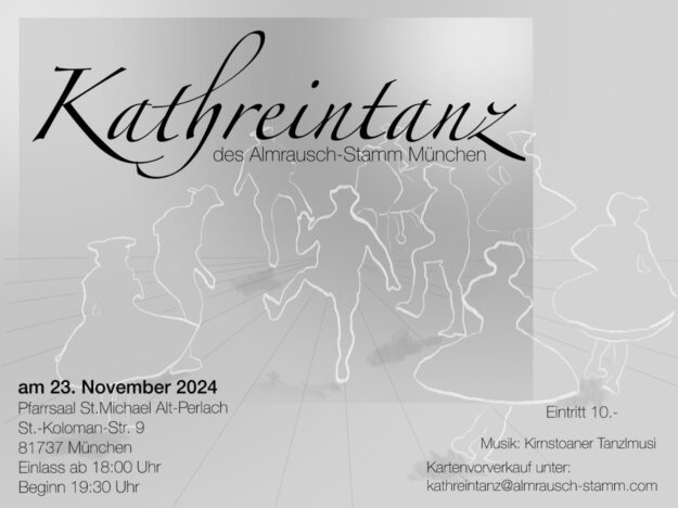 Unser Oberländer Heimatverein Almrausch Stamm hat seine lange Tradition der Kathrein-Tänze im Pfarrsaal St. Michael in München Perlach auf wunderbare Art und Weise erfolgreich fortgesetzt. Am letzten Samstag vor Kathrein fanden sich wieder mehr als sechzig neugierige Volkstanzbegeisterte aus bunt gemischten Gruppierungen und Vereinen ein. Peter Ludwig konnte u.a. unseren Gauvorstand im Isargau, Wolfgang Gensberger…